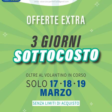 SUPERMERCATO SALZARULO – Dove tutto costa meno – 3 GIORNI DI SOTTOCOSTO – OLTRE AL VOLANTINO IN CORSO – SOLO 17- 18- 19 MARZO 2026 – SENZA LIMITI DI ACQUISTO.